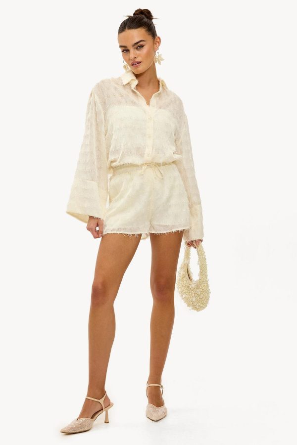 Deze offwhite short heeft een luxe textured design met raw edge details langs de zoom. De casual fit met elastische taille en koorddetail creëert een coole summer look. Style deze short met de matching blouse voor een chique co-ord set.Model informatie: Freya is 175 cm en draagt maat XS.