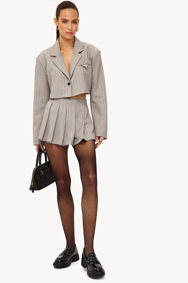 Deze grijze mini skort heeft een luxe pinstripe design met statement plooien. De high-waisted fit met A-line shape creëert een moderne uitstraling. Style deze skort met de matching cropped blazer voor een chique co-ord look.