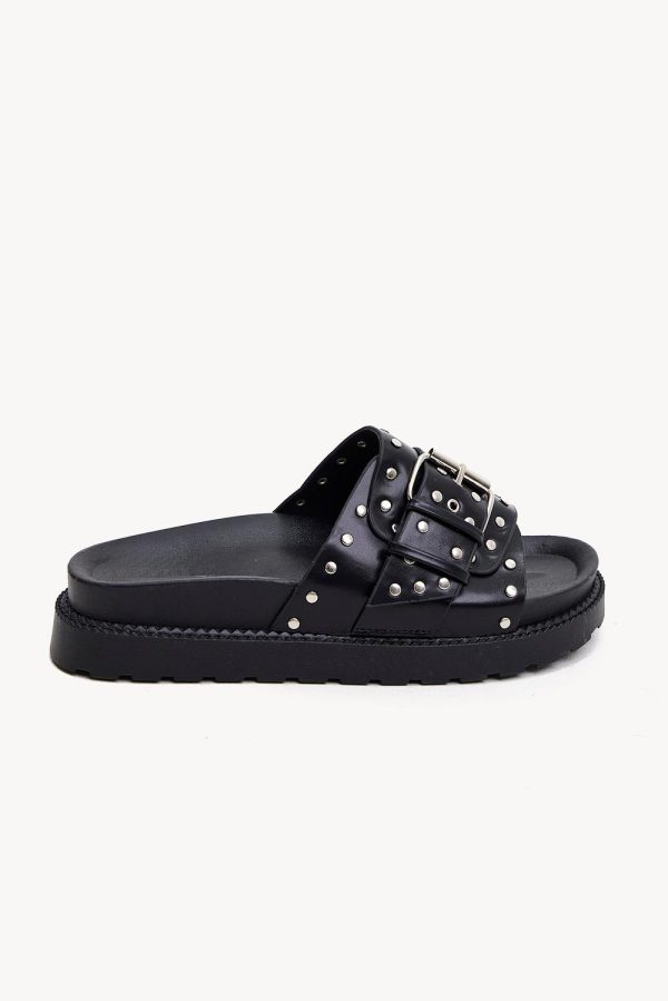 Deze slippers hebben een PU leren stof met gespen en zilverkleurige studs.