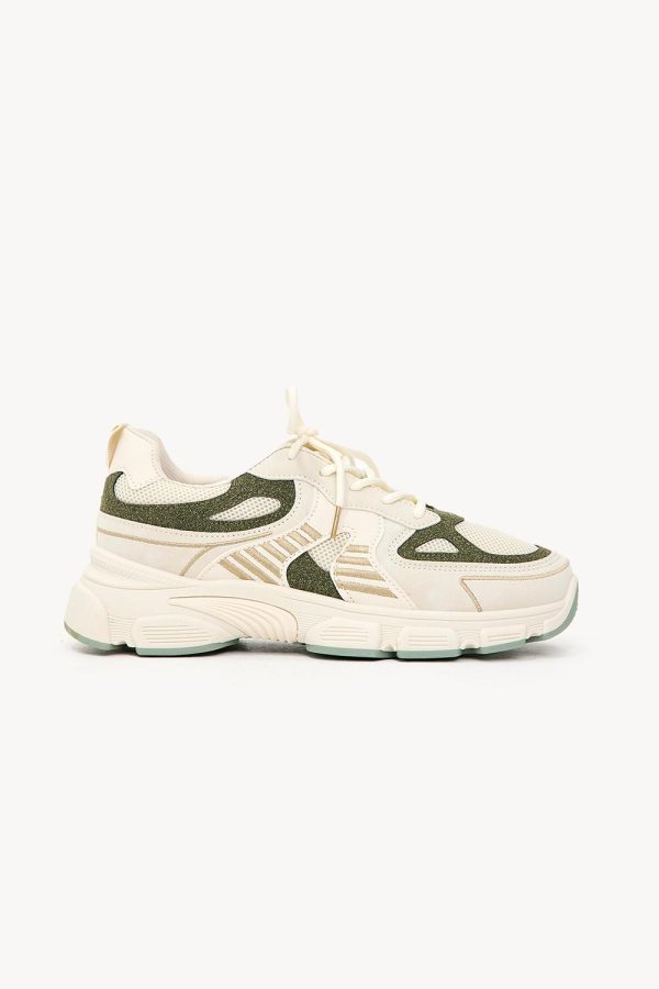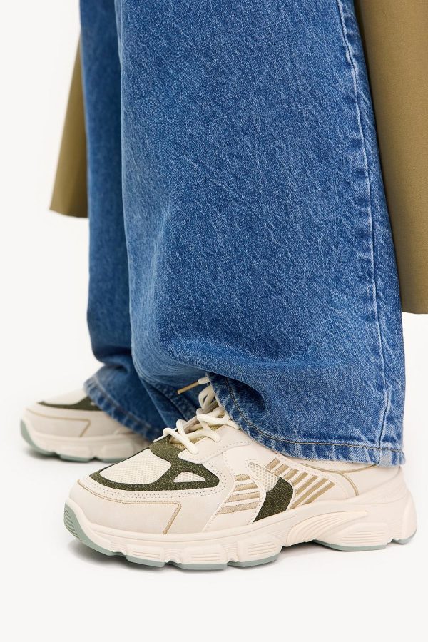 Deze chunky sneakers hebben een coole off-white kleur met olijfgroene details. De moderne design elementen en verhoogde zool geven een on trend twist aan dit statement paar. De lichtgewicht constructie zorgt voor ultiem comfort tijdens je city trips.