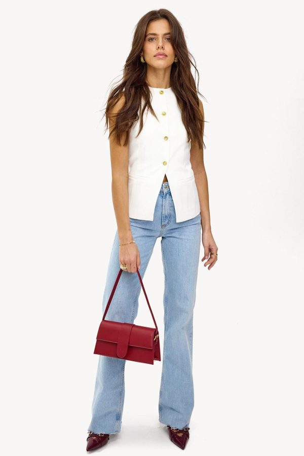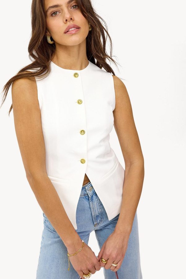 Deze witte gilet heeft decoratieve gouden buttons voor een luxe touch. De strakke fit met subtiele split aan de voorzijde creëert een moderne shape. De minimalistische design maakt deze gilet perfect voor een classy office look.Model informatie: Jools is 176 cm en draagt maat S.