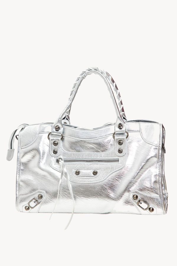 Deze zilveren handtas heeft een metallic shine en statement studs voor een luxe uitstraling. De ruime tas is voorzien van gevlochten handvatten en een praktische rits aan de voorzijde. De coole hardware details en het vegan leather geven deze bag een on trend twist.