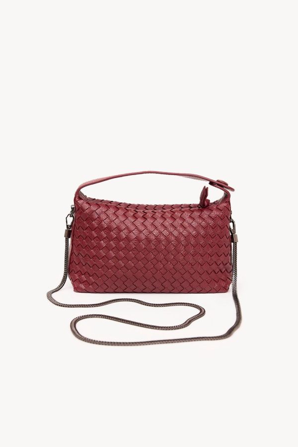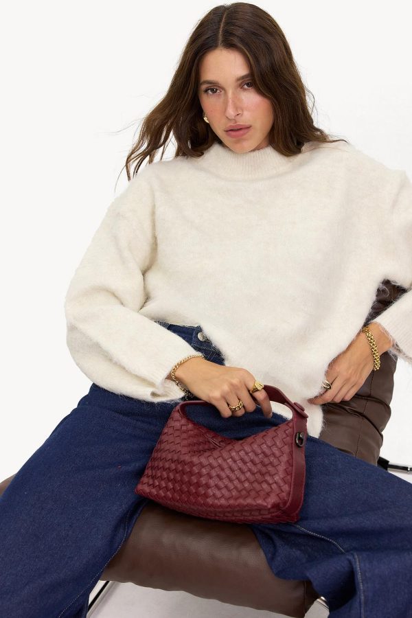 Deze handtas heeft een lang en kort hengsel, een binnenvakje, een zilverkleurige ritssluiting en een gevlochten stof.