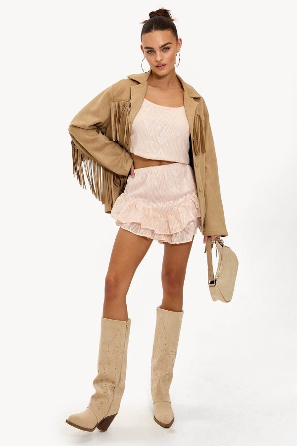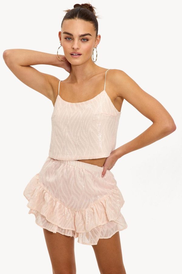 Deze koraal kleurige crop top heeft een luxe jacquard design met subtiele strikdetails op de rug. De spaghettibandjes en cropped fit geven een moderne twist aan het design. De strikjes aan de achterkant creëren een coole open back look.