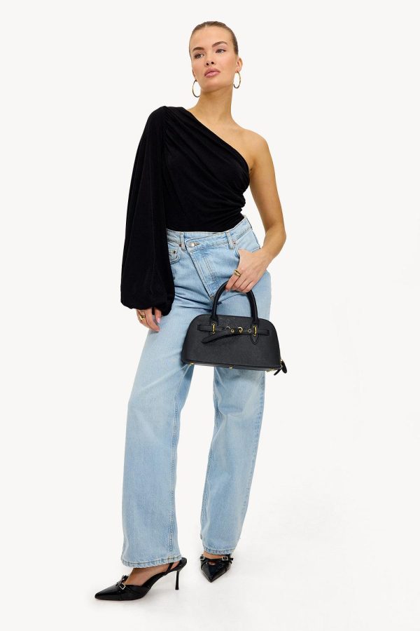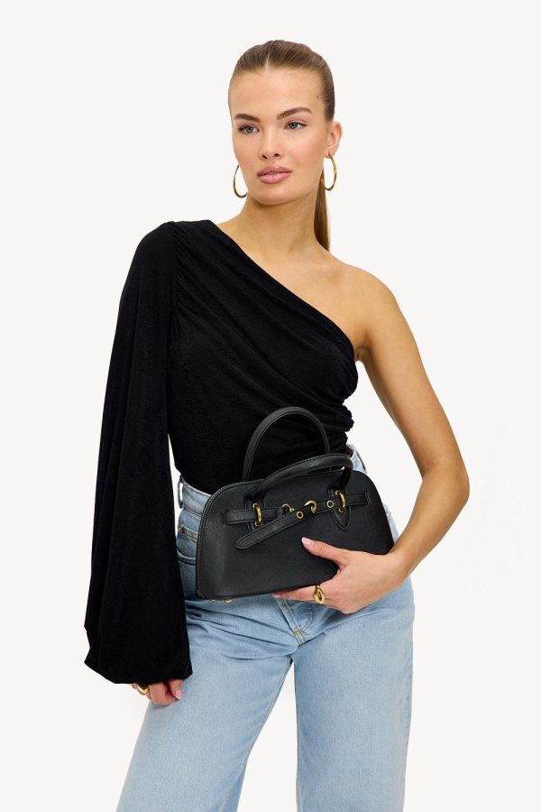 Deze zwarte one shoulder top heeft een luxe ruched design met statement balloon sleeve. De cropped fit en asymmetrische neklijn creëren een coole look. Style deze top met een high-waisted jeans.