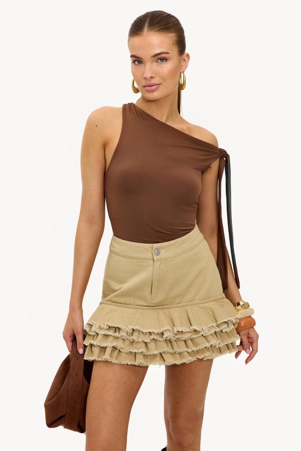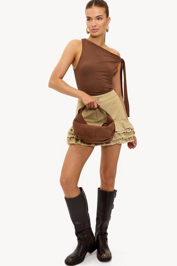 Deze bruine off-shoulder top heeft een stijlvolle one-shoulder design met statement strik detail. De bodycon fit met stretch kwaliteit zorgt voor een elegante shape. Style deze top met een wide leg jeans voor een chique dinner date look.Model informatie: Ida is 175 cm en draagt maat S.