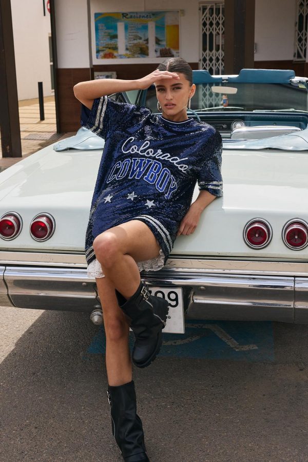 Dit oversized T-shirt in navy heeft all-over sequins voor een statement look. De varsity print met zilveren sterren en contrasterende strepen creëert een luxe sportieve vibe. De relaxte fit met korte mouwen maakt dit shirt perfect voor een coole festival look.Model informatie: Mariia is 178 cm en draagt maat XS.